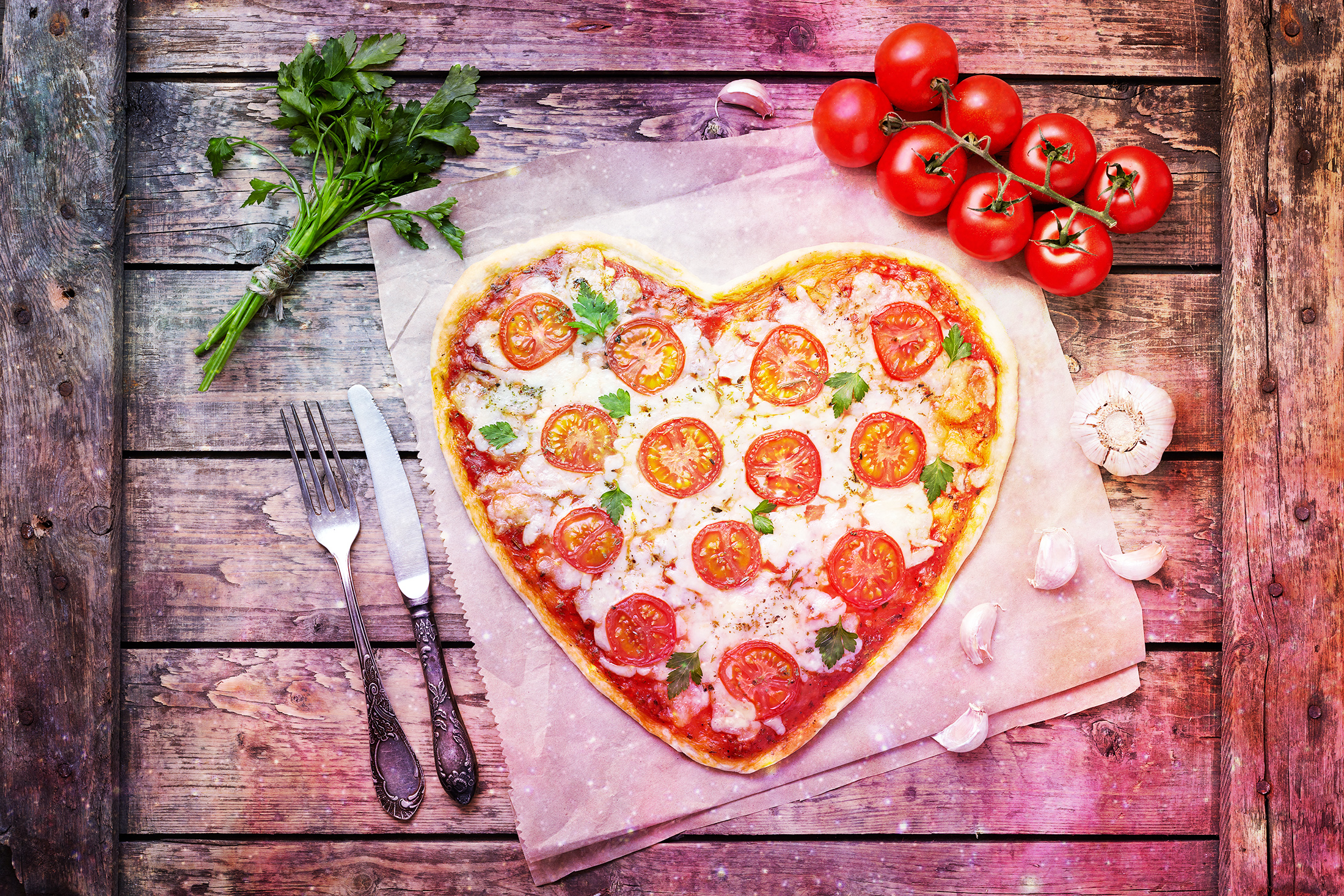 Heart shaped pizza margherita love concept for Valentines Day with mozzarella, tomatoes, parsley and garlic on vintage wooden table background.